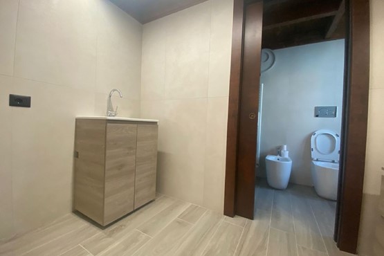 1 bagno con antibagno con lavatrice, asciugatrice, e lavatoio, e un ampia doccia