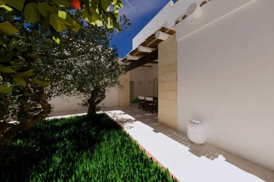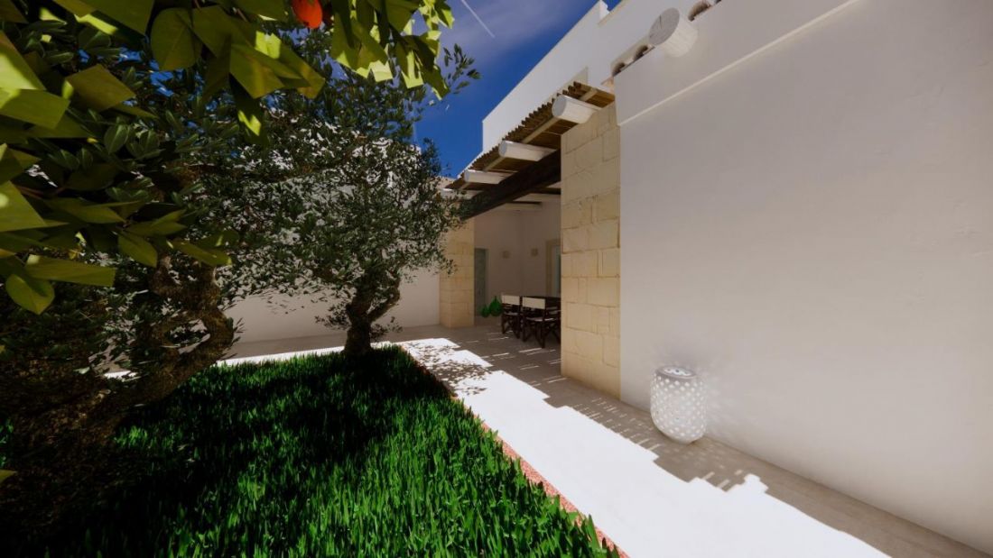 L’ingresso è impreziosito da un pergolato esterno con travi tonde e colonne in pietra leccese, ideale come spazio di accoglienza.