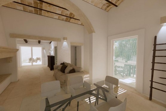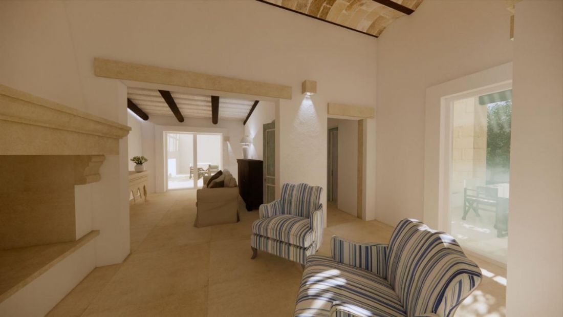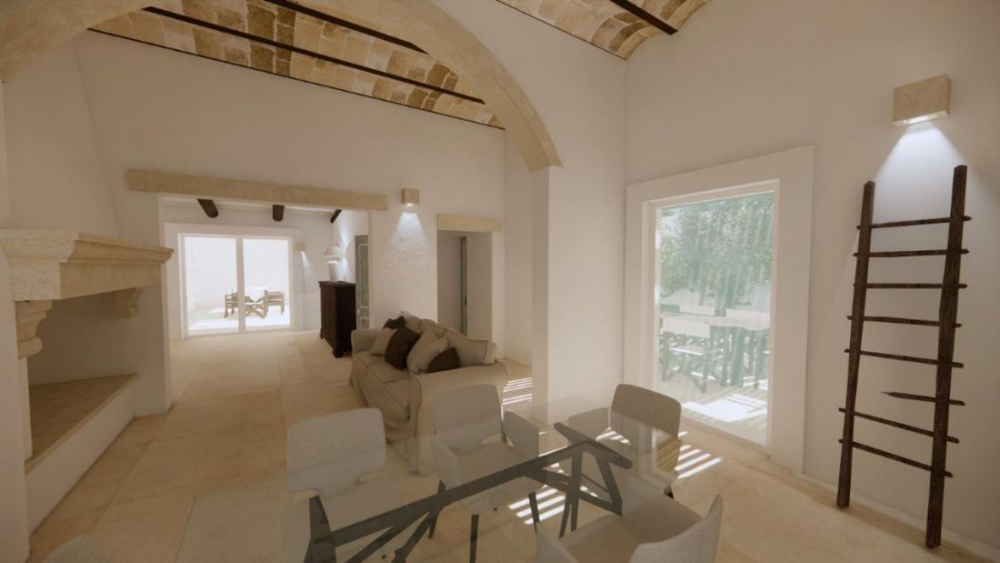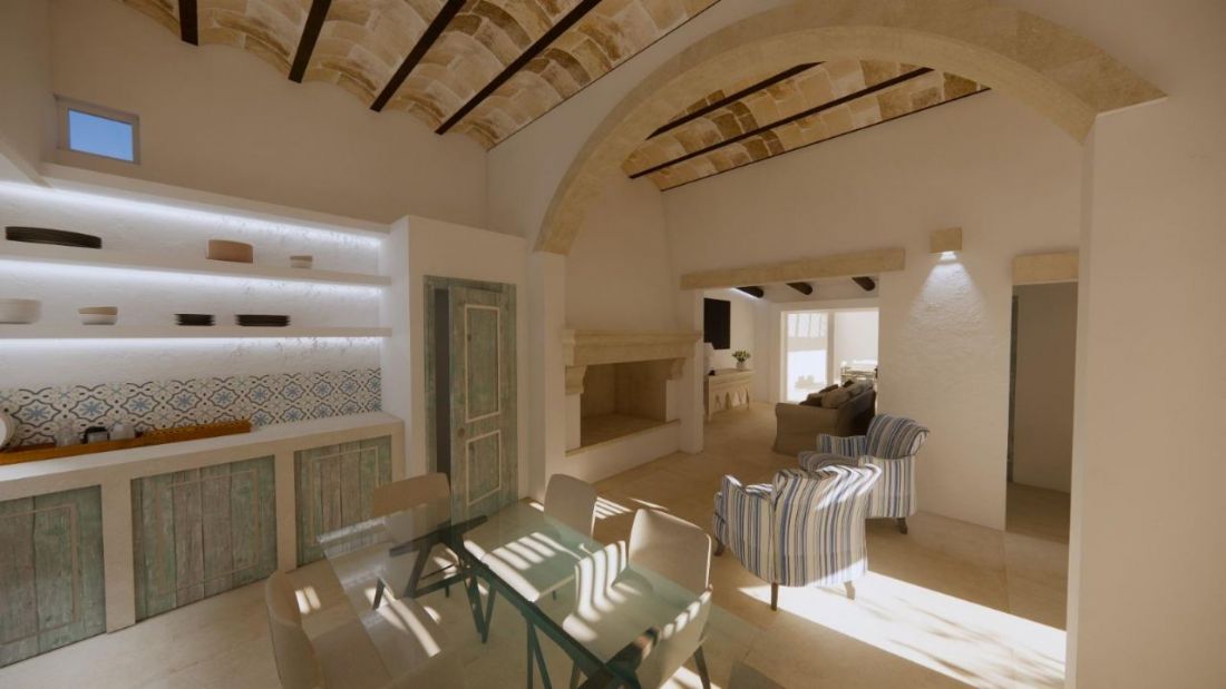 La zona giorno si sviluppa in un soggiorno open space caratterizzato da voltine a vista, un importante arco in pietra leccese e un camino progettato in autentico stile salentino, elementi che conferiscono grande personalità all’ambiente.